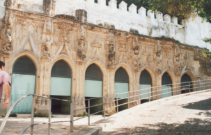 Le tout est surmonté d’une charpente couronnée de pinacles gothiques qui rappellent les dragons représentés dans les Covachas.